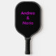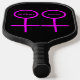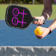 This awesome Pickleball Paddle is designed for lesbians. It features two pink female symbols standing side by side. The background is black and there is customisable pink text inside each of the symbols to put names. There is also custom text on the back to include names or a message.