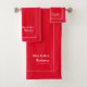 Stylish Mrs and Mrs personalised towel set for the newlywed brides in red and white, with editable script, name and established wedding date