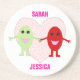 This pretty sandstone coaster features a cute cartoon of a smiling red grape holding hands with a smiling green grape, both grapes have shiny black eyes and pink mouths. The grapes are standing in front of a pretty pink heart and there is customisable pink text above and below the heart so you can personalise it with the name of a lesbian couple. This would make a great valentines day gift.