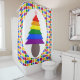 This awesome shower curtain features a rainbow Christmas Tree with 2 small pink female symbols sitting on top of the tree. Each layer of the tree is a different colour of the rainbow. The tree sits in a brown pot and is surrounded by presents. Each present is also a colour of the rainbow, with a different rainbow coloured ribbon and bow. A lovely design for lesbian couples this Christmas.