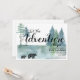 Let the adventure begin, rustic woodland bears baby shower invitation featuring mum and baby bear and a watercolor forest in green and blue hues. Rustic woodlands style. White on the back.