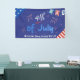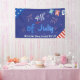 Celebrate Independence Day with this minimalist yet festive party banner. The deep blue background sets the stage for the bold "Happy 4th of July" text in light blue and white. Minimalist illustrations of firecrackers and starbursts in red, white, and blue add a touch of fireworks flair. Hanging buntings with the letters "U", "S", and "A," along with triangular sections featuring stars and stripes, pay homage to the American flag. This design strikes the perfect balance between simplicity and patriotism, making it an ideal choice for your 4th of July celebration decor.