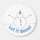 This magnet features a happy snowman with an orange carrot nose and outstretched arms looking up at the snowfall with blue curved text that says "Let it Snow!"