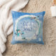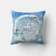 Cute Christmas snowman with "Let it Snow" in blue word art surrounded by blue snowflakes. There is a white wreath surrounding the "Let it Snow" design. Keeping the smiling snowman company are his friends the blue bird, baby blue bird (both sitting on the wreath) and polar bear. The reverse side of the pillow has the same designs. The background is very sparkly with varying shades of light blue.