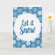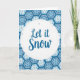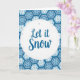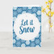 The card immediately sets a festive winter mood with a bright white circle in the center. Inside the circle, in elegant blue handwriting, it reads "Let it Snow." This fancy writing gives off a feeling of joyful excitement and sets the perfect tone for the season. The background is a beautiful pattern of blue hexagons with white accents, each one holding a different snowflake or burst design.