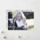 Chic custom photo Christmas greeting card done in a flat style with faux silver glittery like snow, along the top and bottom forming a frame for your picture. White custom text, on the bottom left front of the card, is ready to personalise to read what you want. The back of the card has graphics of a white and grey snowflakes and bokah design. Beautiful way to showcase your favourite picture of the year and share it with friends and family for the holidays. Model photo courtesy of Lorri Lang.