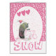 NewParkLane - Christmas Notecard, with a cute cartoon penguin in watercolor, sitting on a tree stem with pink snow, and with 'Let it snow' wish in fun, handdrawn typography, and three cute pink hearts.