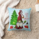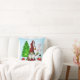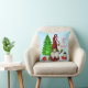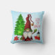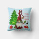 This festive and fun throw pillow to decorate your home for Christmas and/or winter holidays has a winter sky blue background with a smattering of white snowflakes with a tall green pine tree behind the focal point, which features a bearded gnome wearing red and black flannel type clothing, a very tall toque with a brass bell on the end that dangles down the side of the gnome. There is a black lantern with two red poinsettias in front of the lantern and one more on the left side of the gnome. The front of the pillow has red text on it that says, "LET IT SNOW" and the back says, "Gnome for the Holidays" both sayings can be changed to say something else if you prefer.
