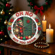 This image features a circular wall clock with a humorous, non-traditional Christmas theme. The central illustration shows an angry-looking elf peering out from a partially opened green door, holding an antique lantern. The clock face is surrounded by a white ring containing the black hour markers and clock hands. The border features festive greenery, poinsettias, candy canes, and large red and gold ornaments. Humorous red text is boldly displayed at the top and bottom: "OH NO" (at the top) and "NOT YOU AGAIN" (at the bottom).