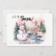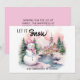 Cute pink snowman with a backdrop of snow-covered mountains and an old church Christmas/holiday greeting card. Custom text says, "Let it snow." Personalise with your family name and any other text you choose.