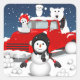 This design features the nostalgia of a vintage red truck with some Arctic animals and a snowman in a wintry scene.