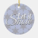 This Let it Snow Winter Snowflake Ornament is a festive decoration for a Christmas tree. It features a grey snowflake pattern on a periwinkle background with the phrase 'Let it Snow' in a white cursive script. Let this ornament create some holiday cheer.