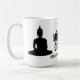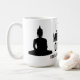 "Let Me Meditate On That (right after I finish my coffee) Buddhist humor quote mug. This jumbo coffee mug features two Buddhas sitting in lotus posture. It pairs a calm meditation image with a light humor twist that resonates with Buddhist practitioners who appreciate their coffee as much as their practice. A light hearted quip perfect for yourself or as a gift for an office coworker, friend, or roommate who must have their morning brew before they sit and stew.