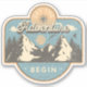 Retro style "Let the adventure begin" text design with mountain view, sun, pine trees and birds decoration on grunge background
