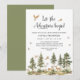 This boy's baby shower invitation features a stunning, warm green watercolor forest scene, beautifully setting the stage for an outdoor-inspired celebration. At the bottom, a delicate illustration of deer adds a touch of woodland charm, symbolising innocence and the beauty of nature.