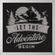 Retro style "Let the adventure begin" text design with mountains, birds, river, pine trees and retro style sunset illustration for everybody who likes nature and retro style design. It is easy to change the background and personalise it.