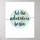 "Let the Adventure Begin." Inspirational words to live by, this message reminds us to look forward to what is ahead and not dwell on the past. Hand lettered calligraphy looking text in a classic black on against a stylised world on a white background works with any decor, dorm room or child's room.