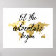 Gift idea for newlyweds as wedding gift or for travellers. Unique faux gold map with "Let the adventure begin" calligraphy quote.
