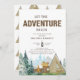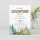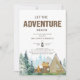 Let the Adventure begin! This fun rustic invitation has a wood panelled "ADVENTURE" and script font. The bottom has a watercolor forest, mountains and scenery. It is finished by the tan, green and brown camping items which include a tent and fire. The back has a pattern of the same watercolor tent.