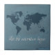 Let the adventure begin text design with world map decoration on grunge, blue background