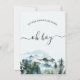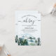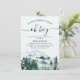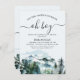 This the adventure begins baby shower invitation features an atmospheric watercolor wilderness scene with pine trees and mountains and a very faint baby blue background. Great for a boy's winter or wilderness themed baby shower.