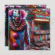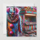 Halloween party invitations. Let the games begin. Scary clown at a carnival game booth psychedelic comic book style Halloween party invitations.