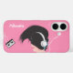 This minimalist artwork by Dyah Paramita features a striking digital mixed media of a girl listening to music where it is leading her to be creative, contrasted by a pastel colour pink. The simplicity adds depth, evoking themes of solitude, contemplation, creativeness or self-discovery. This is a personalised iphone case where you can add your name.