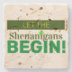 This design is made up type. "LET THE" is in a green banner, the "I" in Shenanigans is dotted with a shamrock and "BEGIN!" is in green, bold type.