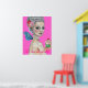 Let them eat cupcake is my original art acrylic painting of Marie Antoinette as Faerie Godmother. Let them eat cupcake. She's standing in front of a french blue wall with fleur de lys patterning; she's bare skinned, but dressed in pearls, feathers and roses, with her white hair in a pompadour. She's holding a cupcake dotted with tiny red love hearts and a cherry on top.