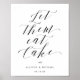 Simple Elegant Calligraphy Script Wedding Reception Let them eat cake Sign in beautiful flowing fancy letters and your personalised names, location, and date. A stylish yet simple formal design in black and white or any background colour you choose. Just click the customise further link, shown under the text personalisation area on the right, and choose your custom colour background. This sign poster template makes it fast and easy to create stunning additions to your wedding decor. Signs can be enlarged, there are many sizes to choose from, as well as options for custom framing and matting. Welcome to our wedding custom signage.