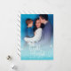 Holiday card in turquoise, white, and silver, featuring "Let your heart be light" written in a whimsical script, surrounded by little stars.