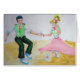 A pair of rock 'n' roll or swing dancers. A girl wearing a poodle skirt, white bobby socks, saddle shoes a green stripes t shirt and pink ribbon in her pony tail. A teddy boy with a DA haircut green waistcoat / vest with pink neck tie and dark green trousers