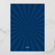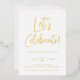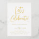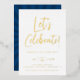 Modern script Let's Celebrate!, foil birthday party invitation. Back of card features cool retro sunburst pattern in blue.