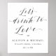Simple Elegant Calligraphy Script Wedding Reception Let's drink to love Sign in beautiful flowing fancy letters and your personalised names, location, and date. A stylish yet simple formal design in black and white or any background colour you choose. Just click the customise further link, shown under the text personalisation area on the right, and choose your custom colour background. This sign poster template makes it fast and easy to create stunning additions to your wedding decor. Signs can be enlarged, there are many sizes to choose from, as well as options for custom framing and matting. Welcome to our wedding custom signage.