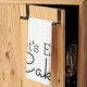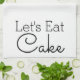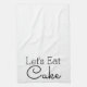 Modern white kitchen towel with the words "let's eat cake" in black lettering.