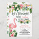 Tropical flowers, green leaves, and pink flamingo is the focus of this bachelorette party invitation. Have a great time celebrating the new bride to be with a tropical bash.