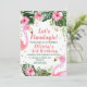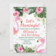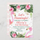 Bold flamingo themed girl's birthday invitation. This design features two pink flamingos and some gold and faux gold tropical foliage as well as some hot pink hibiscus and rose gold glitter on the sides. Great for a summer girl's birthday party.