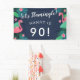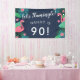 Flamingo birthday party banner with an illustration of pink flamingos, palm leaves, palm fronds, and flowers, and charming fonts against a deep blue background. Add the name and the age of the person celebrating their birthday.