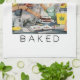 Funny pot pun kitchen towel with a vintage or retro baking scene titled LET'S GET BAKED!