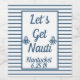 Perfectly preppy seersucker striped customisable "Let's Get Nauti" wine label in navy blue and white stripes with navy lettering for your nautical bachelorette party!