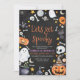 This spooktactular birthday party invitation is perfect for Halloween-themed or October celebrations! The front of this unique card features "let's get spooky!" and your event details in modern typography with a border of ghosts, a wizard hat, a purple bat, a pumpkin balloon, and a spider's web.