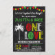 ONE LOVE WEDDING ENGAGEMENT JAMAICAN REGGAE THEMED PARTY INVITATION. Makes a fun and memorable wedding engagement party invitation! The invite features Jamaican/Reggae themed graphics on a faux chalkboard background.