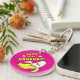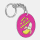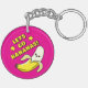 Adorable keychain, featuring a cute cartoon, kawaii happy yellow banana with the sweetest smiles, big round eyes and half peeled. Above him in yellow lettering with a black drop shadow reading 'Lets Go Bananas!' Two bright yellow stars are either side of the words.