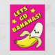 Adorable postcard, featuring a cute cartoon, kawaii happy yellow banana with the sweetest smiles, big round eyes and half peeled. Above him in yellow lettering with a black drop shadow reading 'Lets Go Bananas!' Two bright yellow stars are either side of the words.