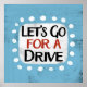 "Let's Go For A Drive" is a cute text design in light blue with black and red text, along with a white accent shape and white textured whimsical dots surrounding it.