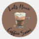 Delight your loved ones with the charming round sticker. Apply it to your invitation envelopes to convey the special request for having a coffee date soon. This watercolor latte, brimming with coffee and foam in a glass mug, features a delightful message, "let's have a coffee soon," adding visual appeal and setting the perfect tone for the occasion.