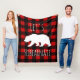 Cute "let's hibearnate" typography fleece blanket featuring a white bear silhouette over a rustic buffalo check plaid background in red and black.