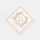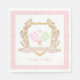 Impress your guests with these beautiful custom pickleball party napkins. These napkins have a watercolor image of a crest surrounded by branches with green and pink gingham pickleball paddles in the centre. There is a pink gingham border around the edge with a coordinating pattern on the back. Text says "Let's Hit the Court." Colours used include moss green, blush pink and and tan. You can personalise with a name.
