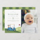 First birthday golf theme "Let's Par Tee" with a golf course and gold car scenery and argyle pattern reverse.