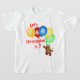 Let's Party 7th birthday custom shirt featuring a prince of a teddy bear all decked out in a colourful jewelled crown and bunches of colourful balloons with letters on them that spell out PARTY. Personalising with your child's name makes it extra special. We specialise in custom-made designs, so contact us if you would like a unique made-to-order layout using this basic royal teddy bear design for your kid's memorable birthday celebration.